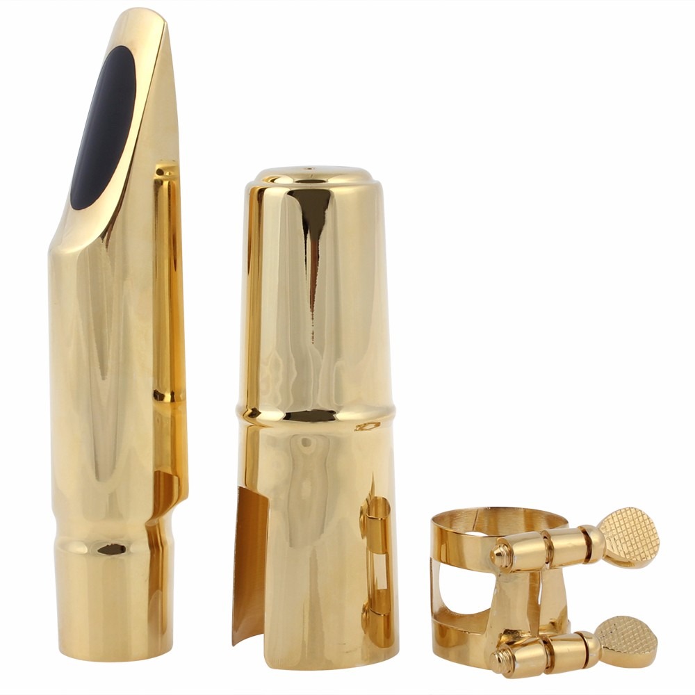Boquilha para sax alto – acompanha braçadeira de metal niquelado e cobre boquilha em metal dourado.